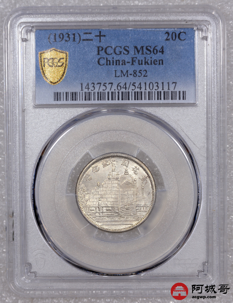 Lot:21 黄油原光 民国二十年福建黄花岗贰角 PCGS MS64