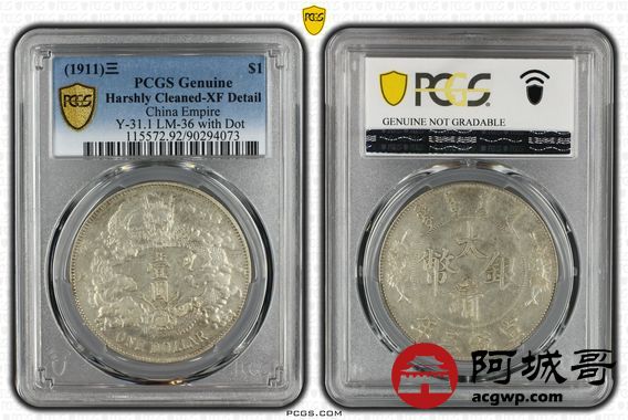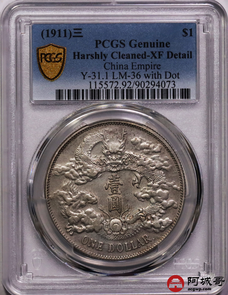 Lot:7 深打 大清宣三壹圆带点 PCGS XF