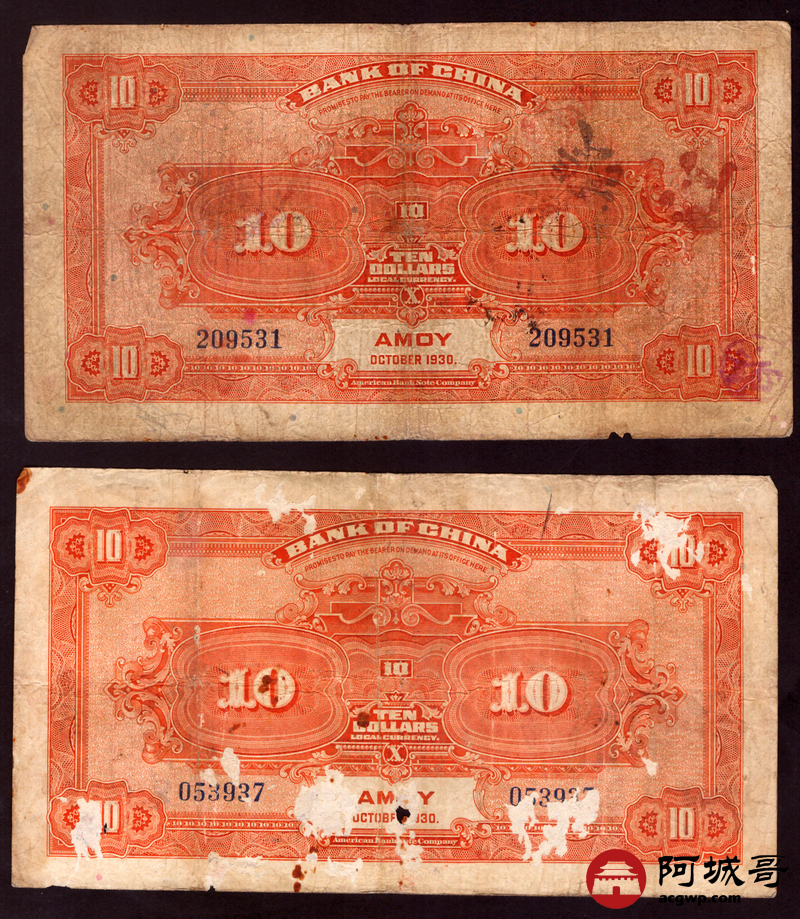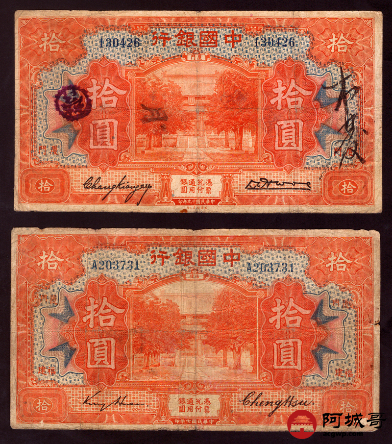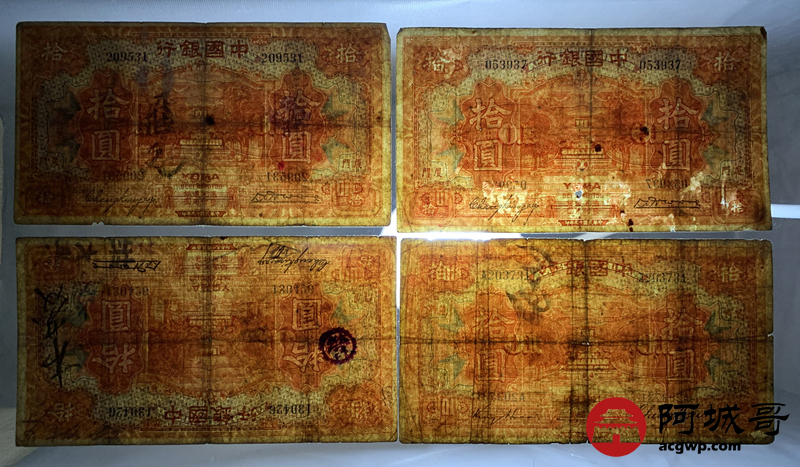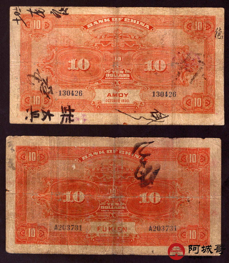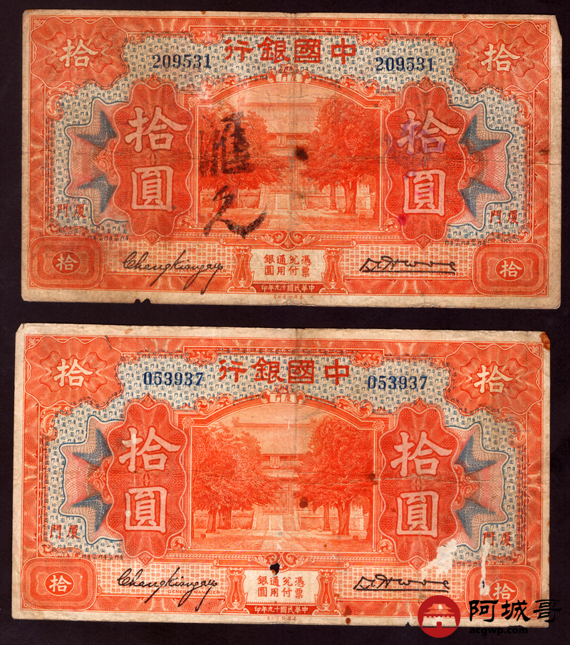 Lot:67 民国7年 中国银行 拾圆 厦门地名 4张 67至69成新