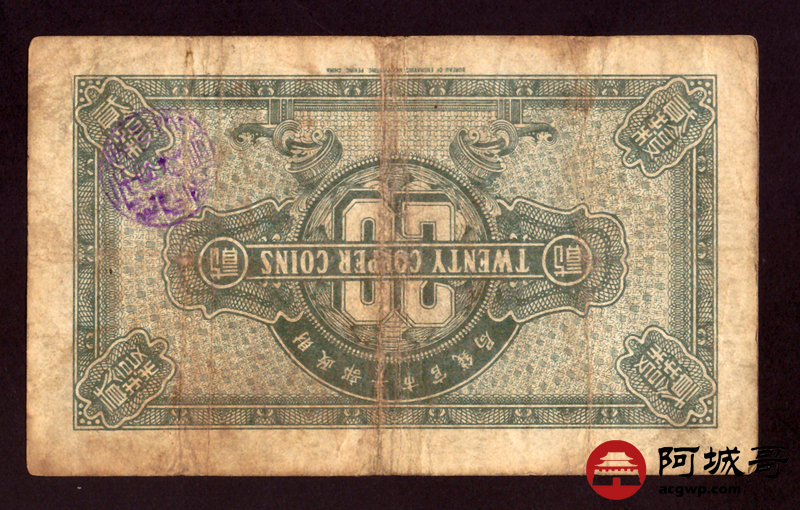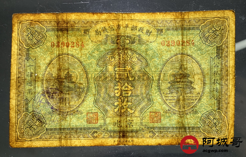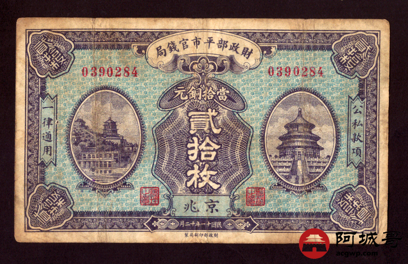Lot:80 民国十一年 财政部平市官钱局 当十铜元贰拾枚 京兆地名 细孔约7成新