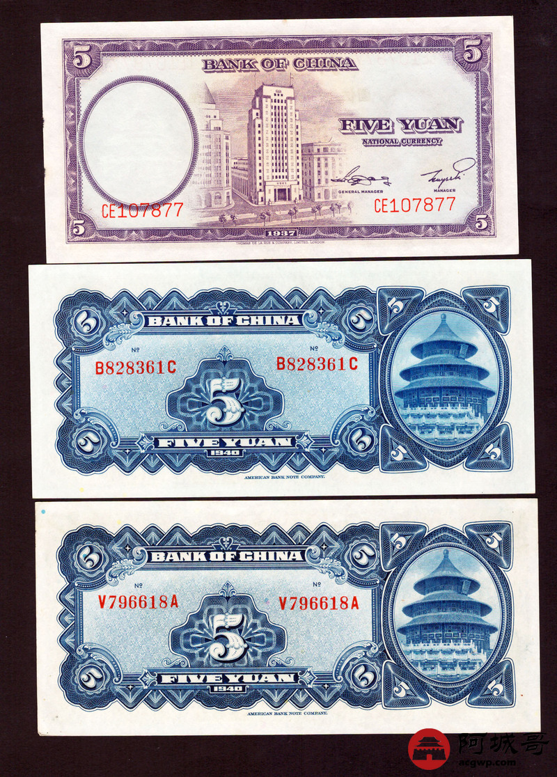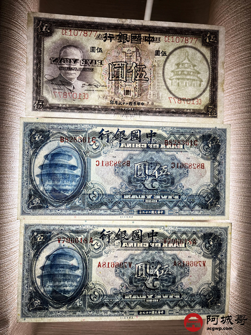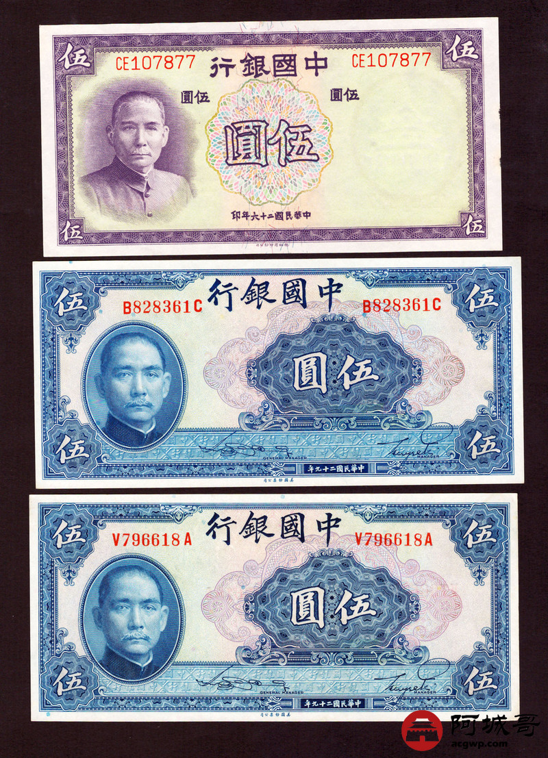 Lot:51 民国时期 中国银行纸币3张 从上至下8成新、95成新、9成新