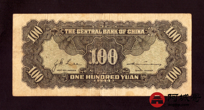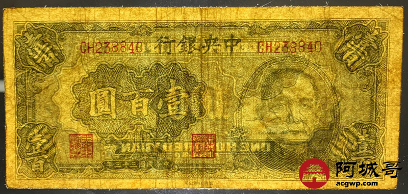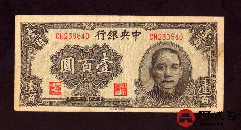 Lot:63 民国三十三年 中央银行 壹佰圆 7成新