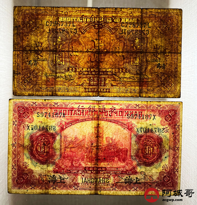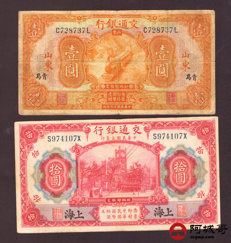 Lot:62 民国时期 交通银行 两枚 69至7成新