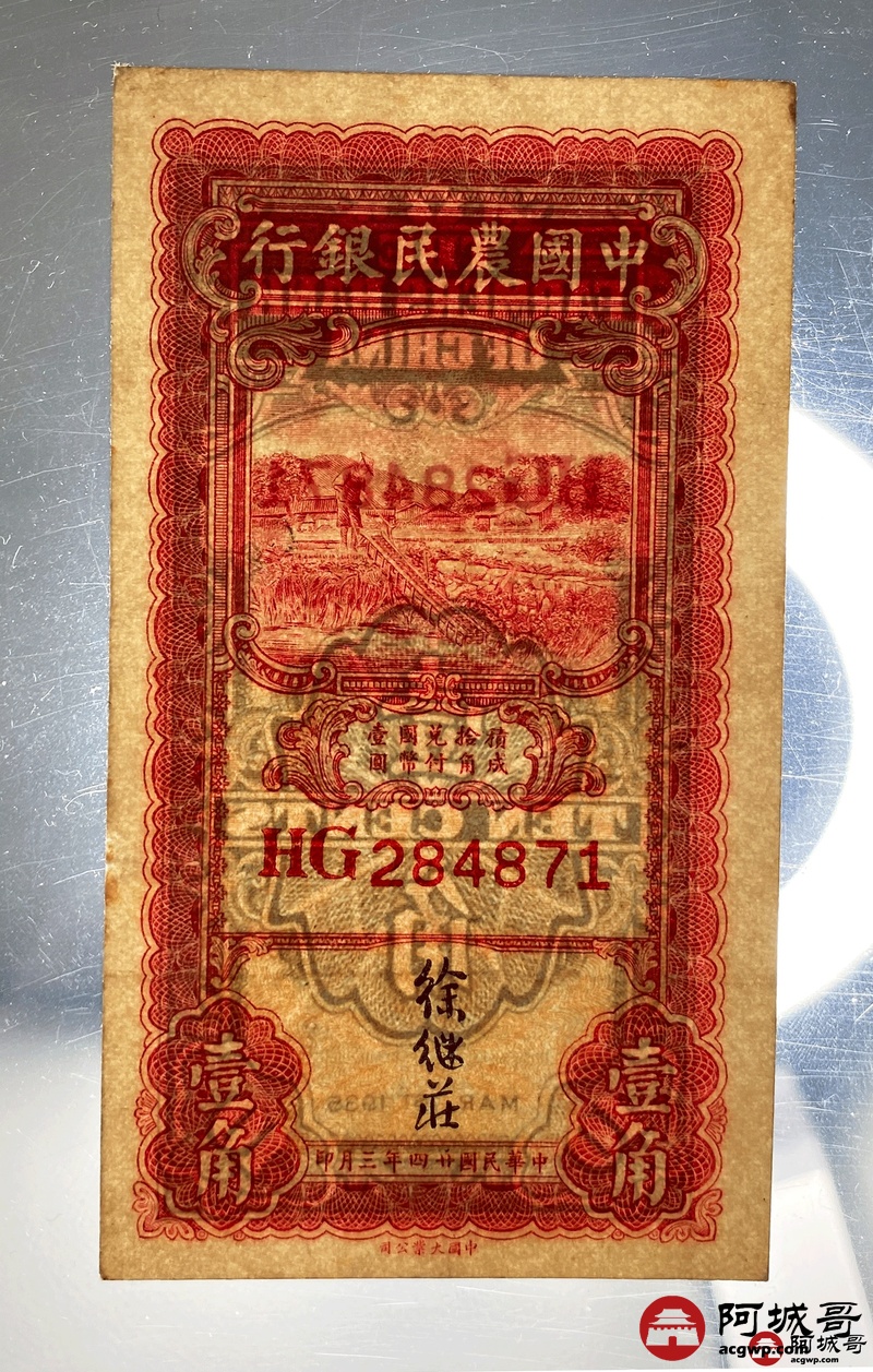 Lot:61 中国农民银行 民国24年 壹角 8成新