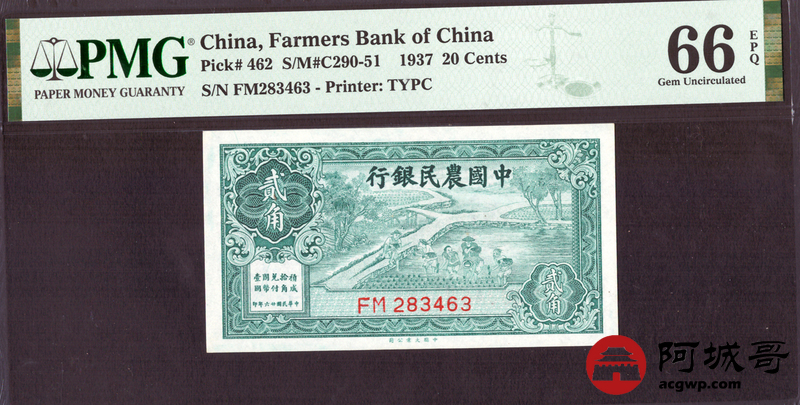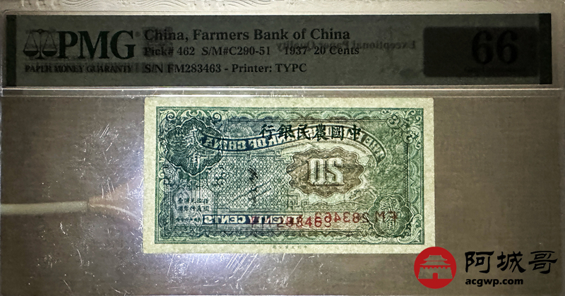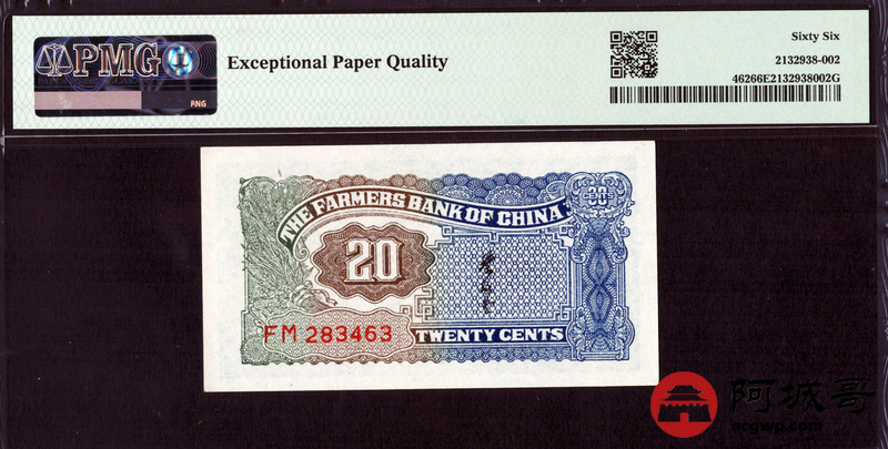 Lot:52 民国26年 中国农民银行 贰角 PMG 66EPQ