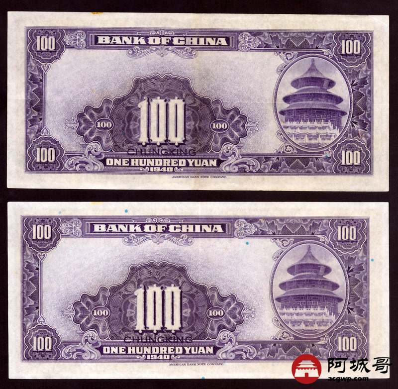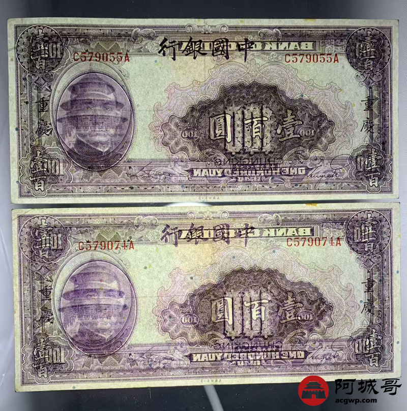 Lot:5 民国二十九年 中国银行 壹佰圆 重庆地名 2张 9成新