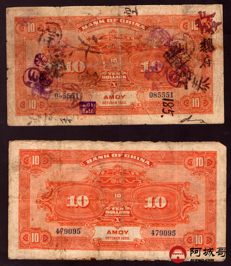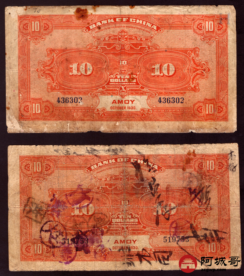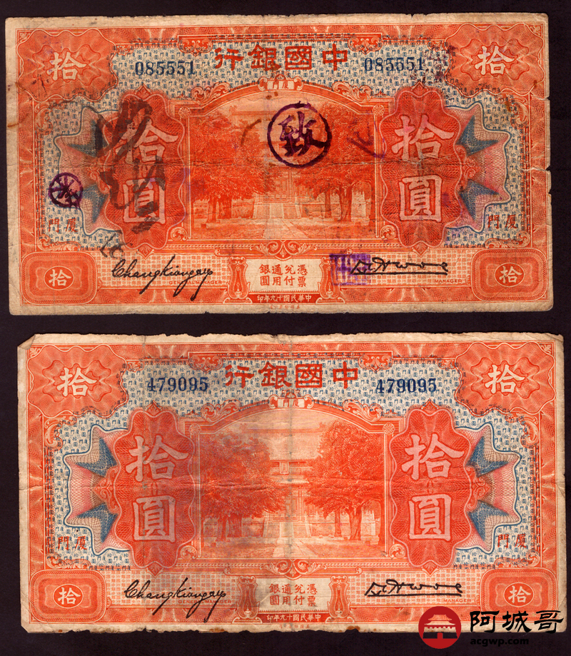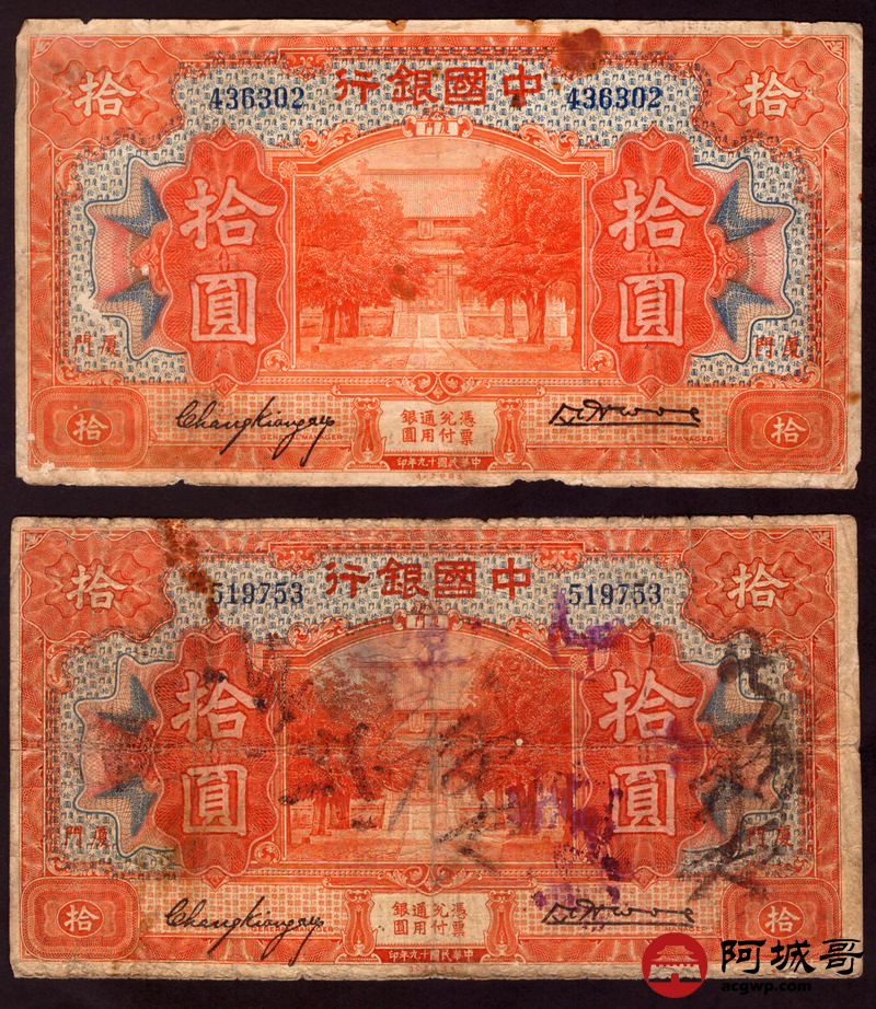 Lot:84 民国十九年 中国银行 拾圆 厦门地名 4张 67至68成新