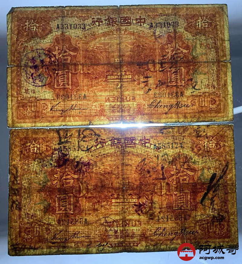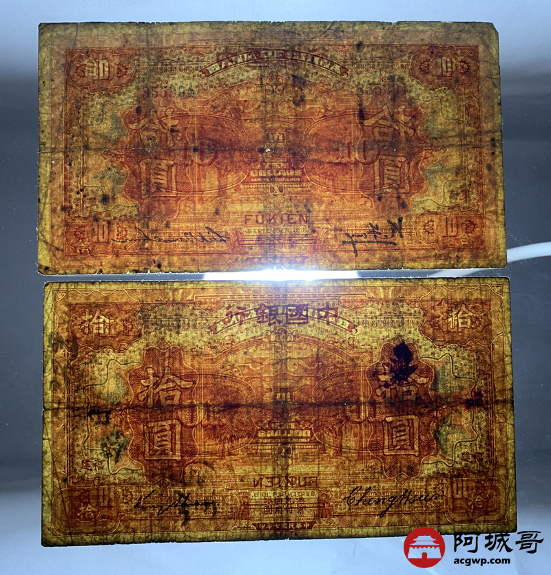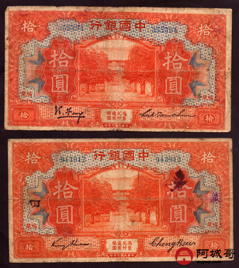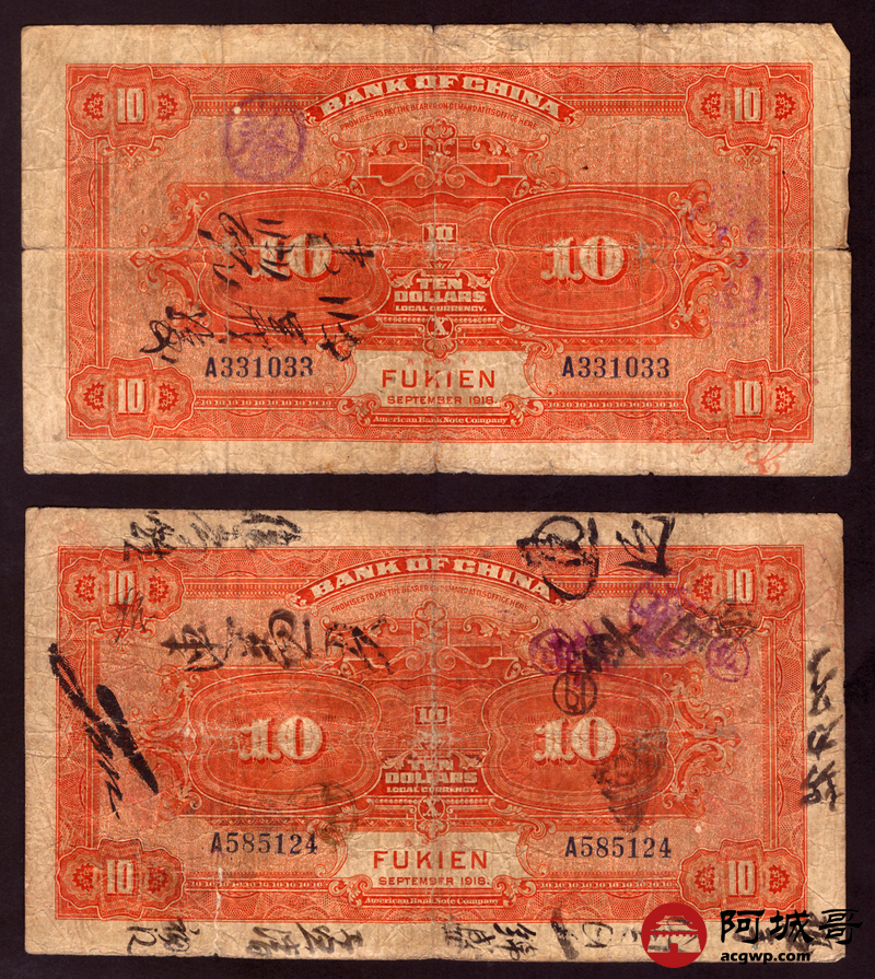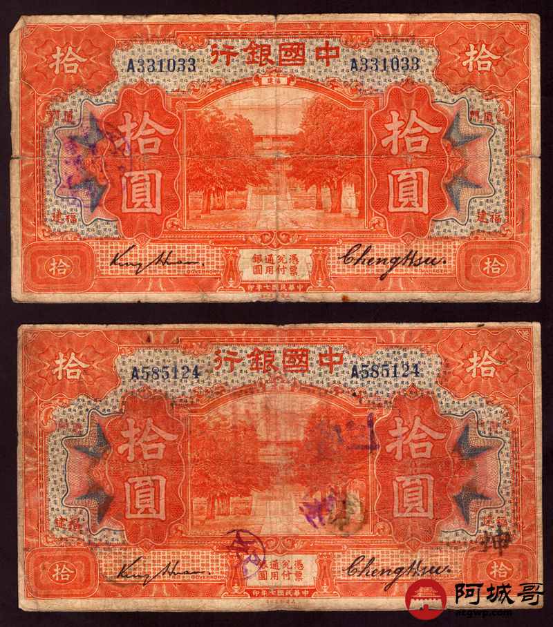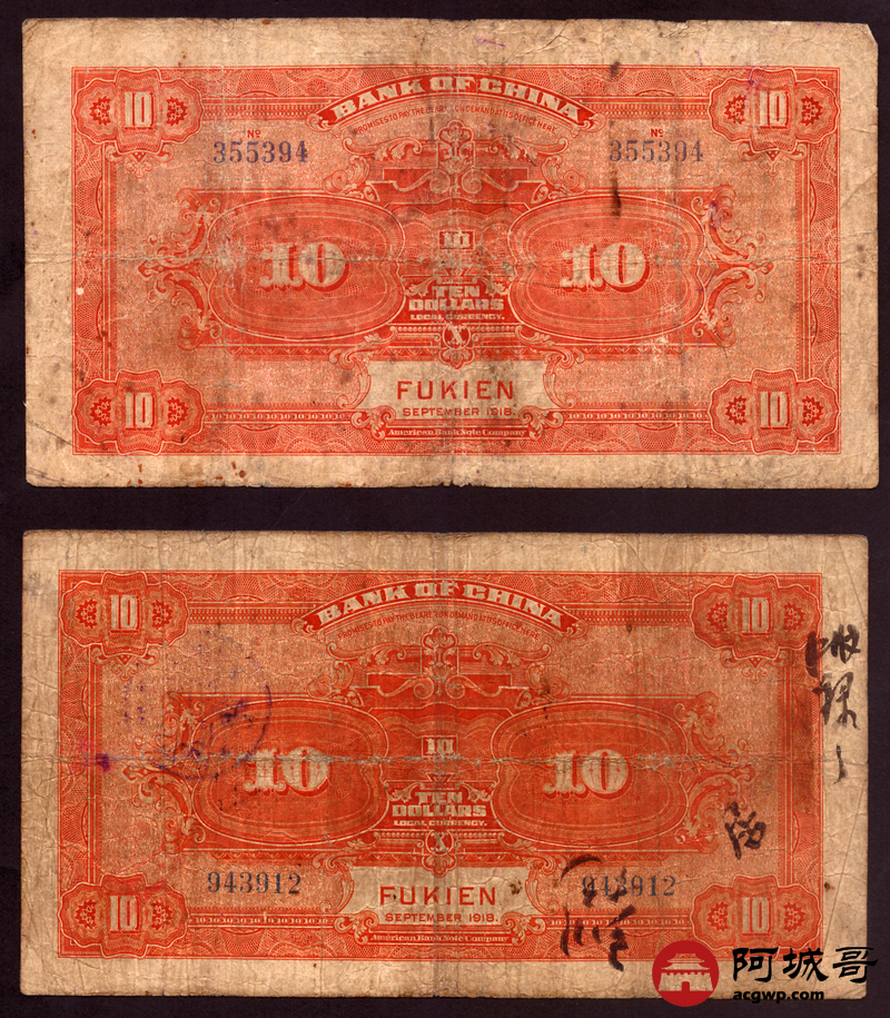 Lot:87 民国十九年 中国银行 拾圆 福建地名 4张 68至69成新
