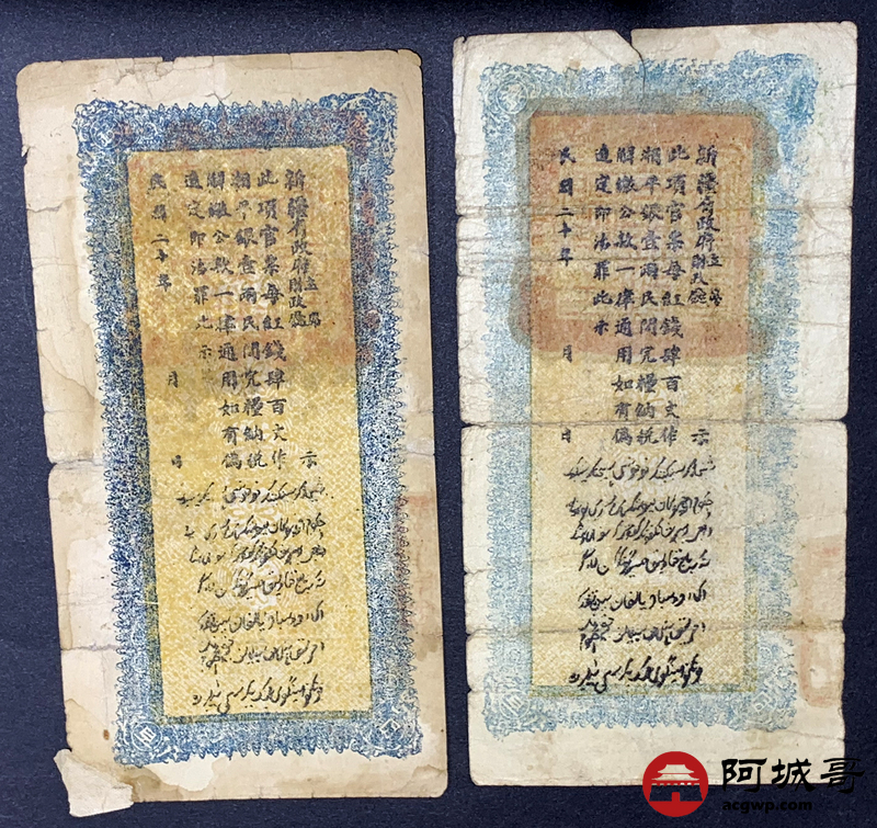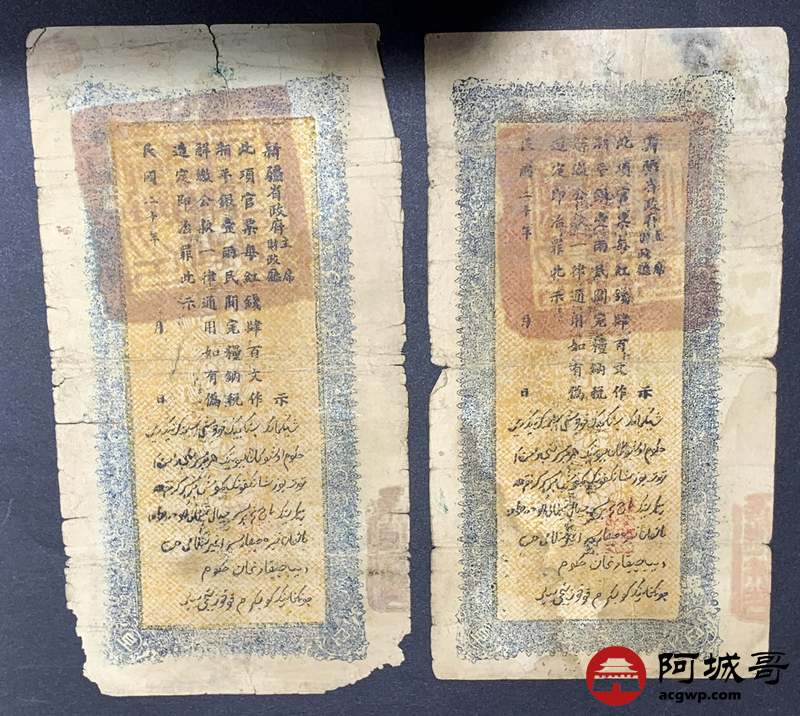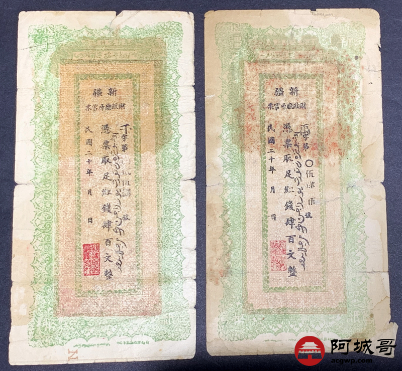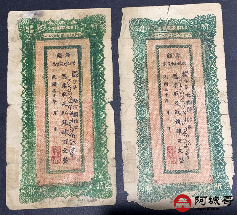Lot:49 民国20年 新疆财政厅库官票 红钱肆佰文整 4张 66至67成新 一张微修