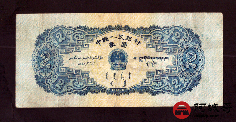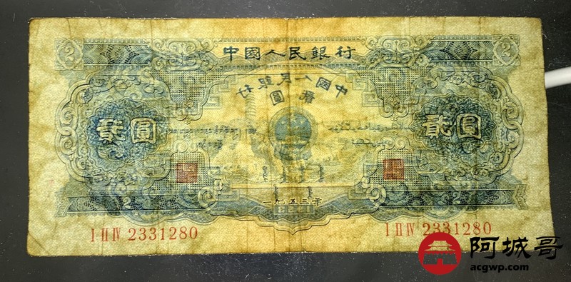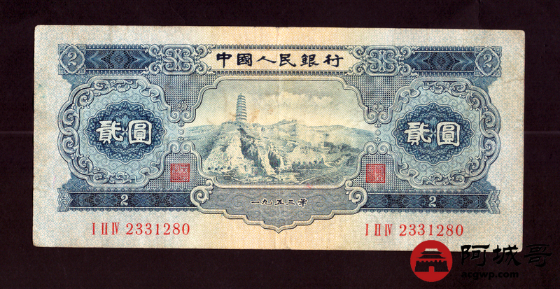 Lot:7 二版 1953年 宝塔山贰圆 72成新 靓号无47