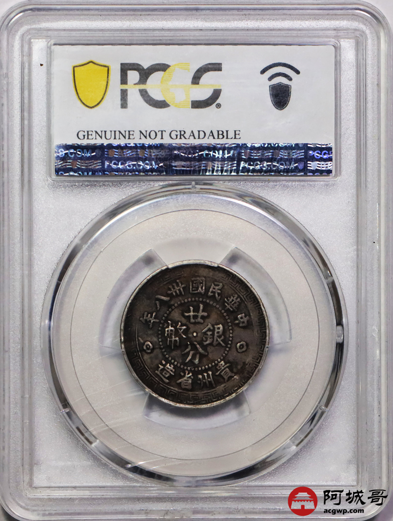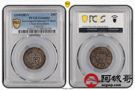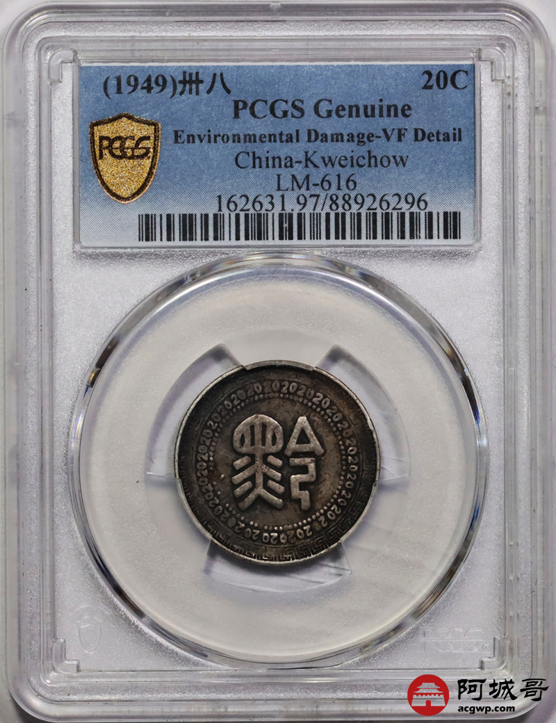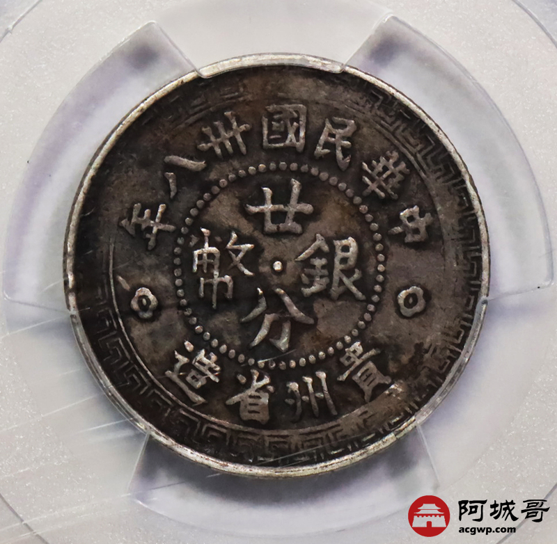 Lot:17 原味老包浆民国三十八年贵州黔字二十分 PCGS VF 盒牛毛纹