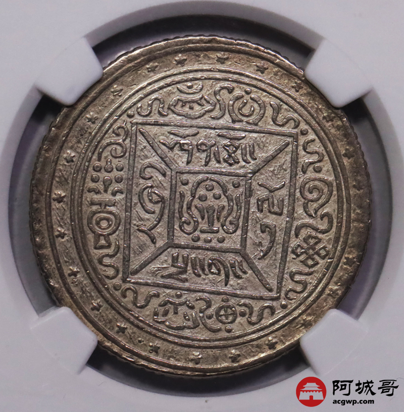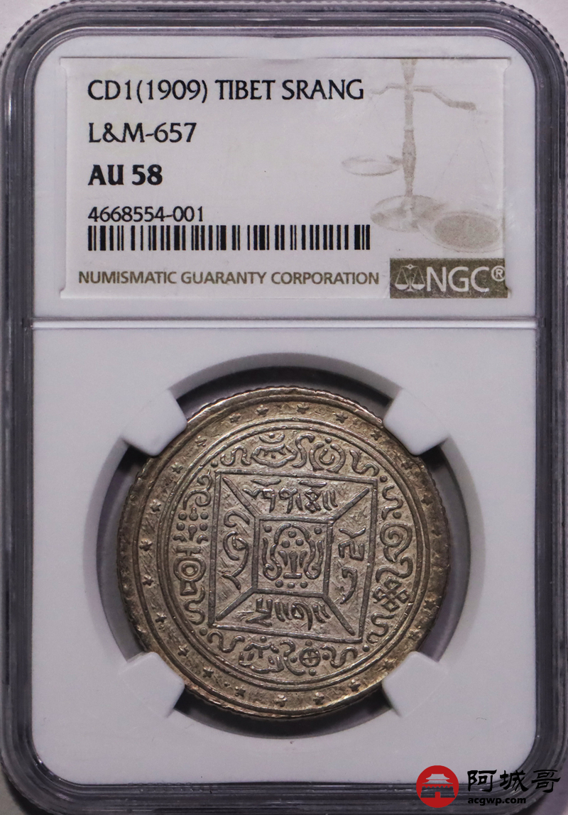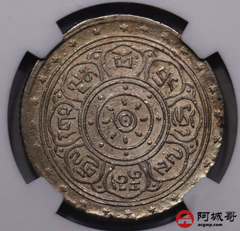 Lot:21 1909年西藏宣统大方块桑康果木一两银币 NGC AU58