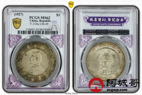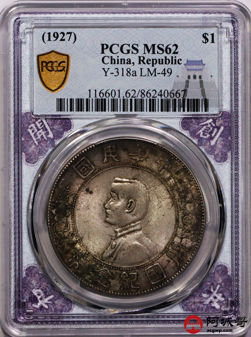 Lot:9 原味包浆 转光 孙像小头壹圆 PCGS MS62