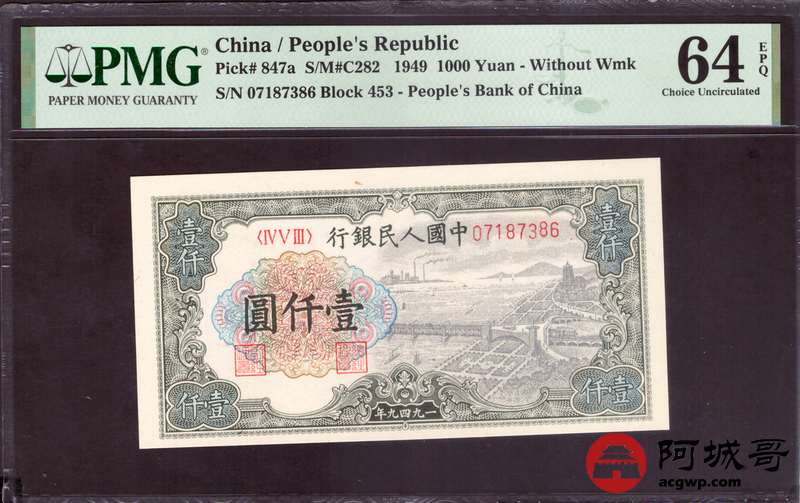 Lot:8 一版 1949年 壹仟圆钱塘江桥 无水印版 PMG 64EPQ 好号无4
