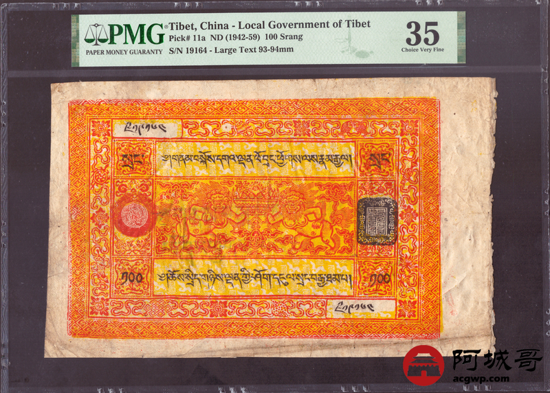 Lot:22 西藏老纸币 100两 PMG 35 品相不错