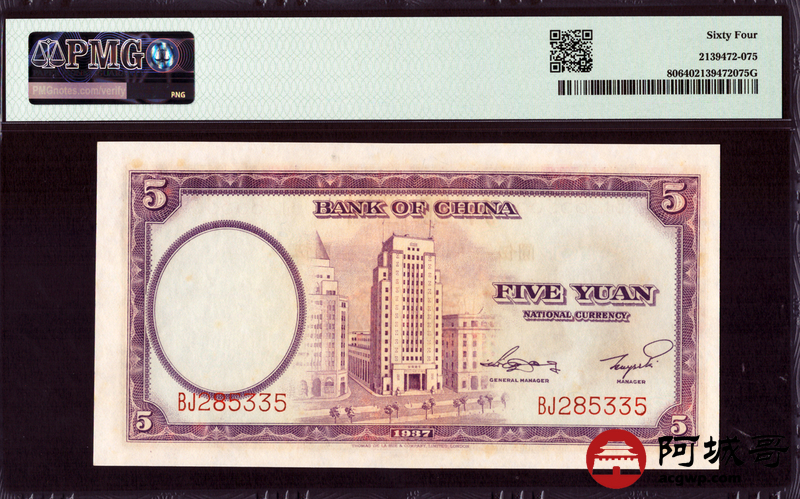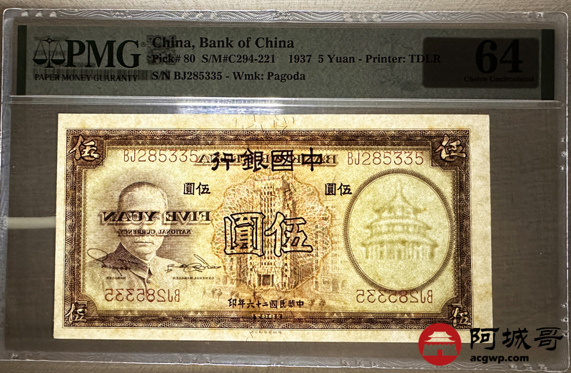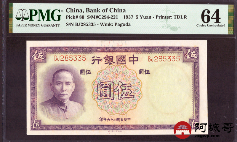 Lot:7 民国26年 中国银行 伍圆 PMG 64 好号无47