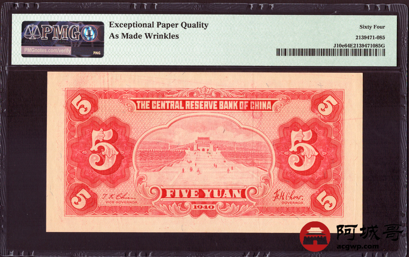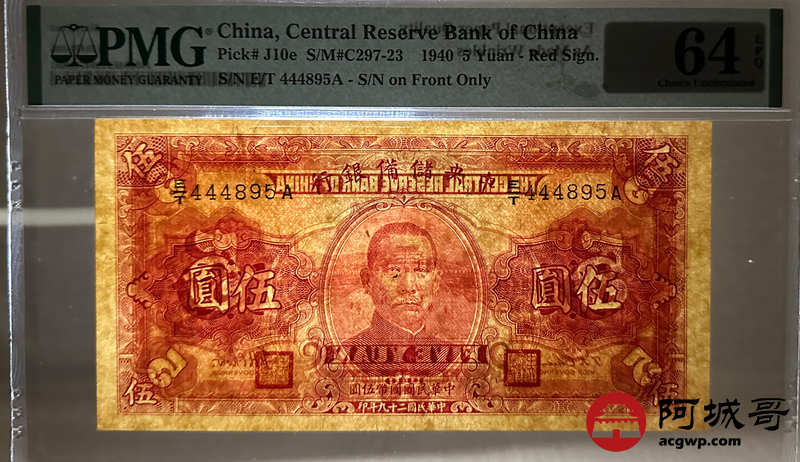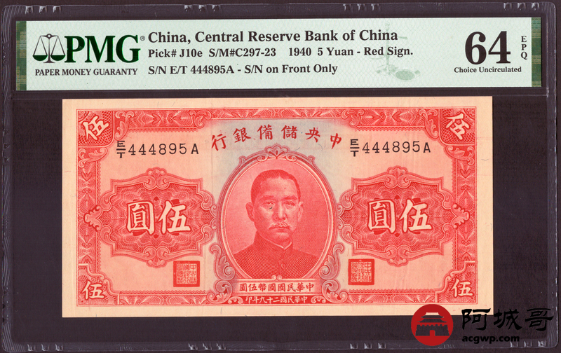 Lot:3 民国29年 中央储备银行 伍圆 PMG 64EPQ