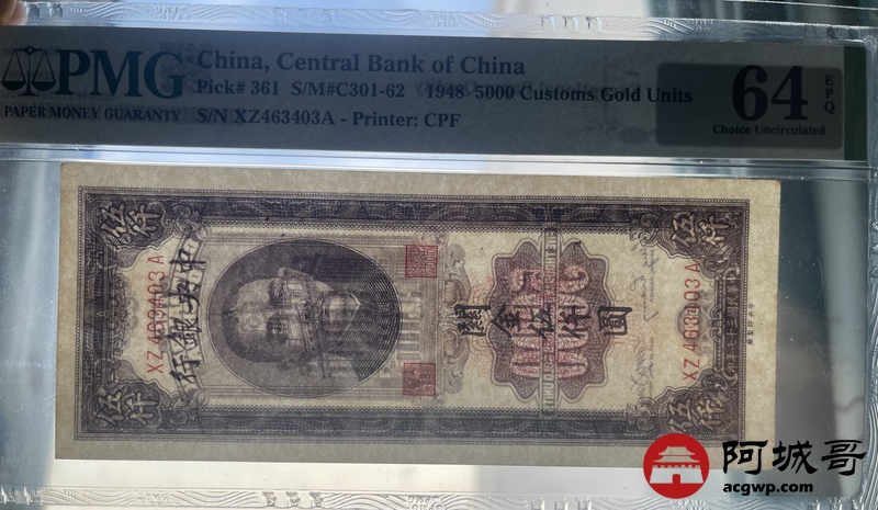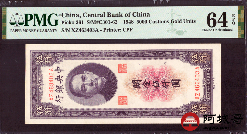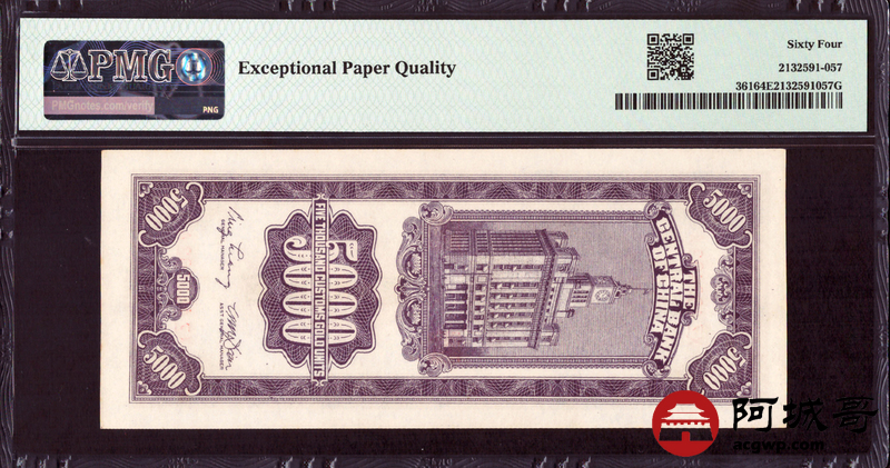 Lot:15 民国37年 中央银行 关金伍仟圆 PMG 64EPQ