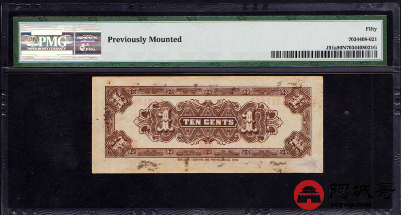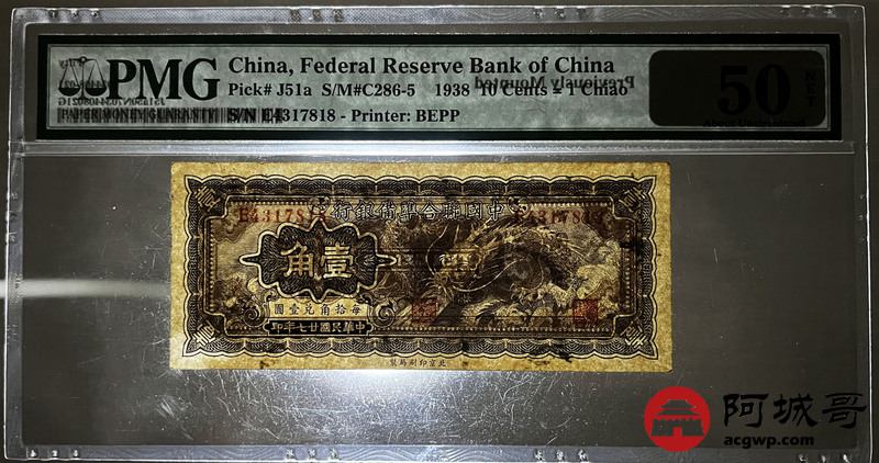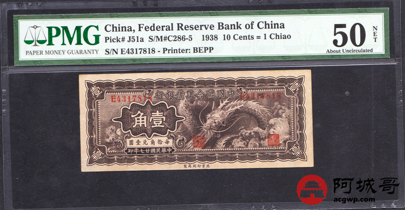 Lot:35 民国27年 中国联合准备银行 壹角 PMG 50