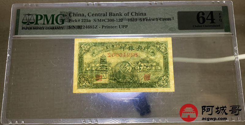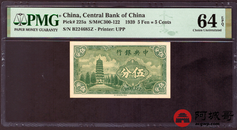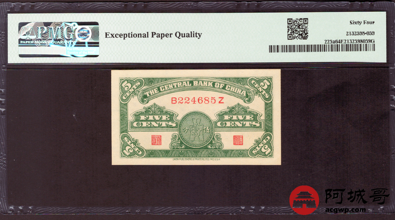 Lot:27 民国二十八年 中央银行 伍分 PMG 64EPQ