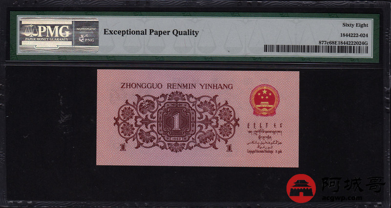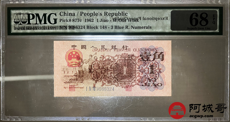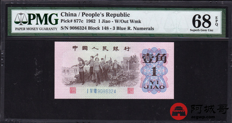 Lot:17 三版 1962年 壹角 蓝3冠 平版 好号全程无7高分 PMG 68 EPQ