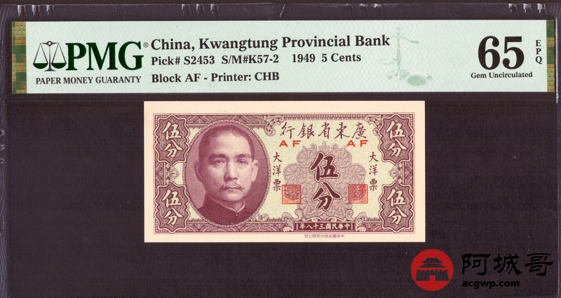 Lot:1 民国38年 广东省银行 伍分 PMG 65EPQ