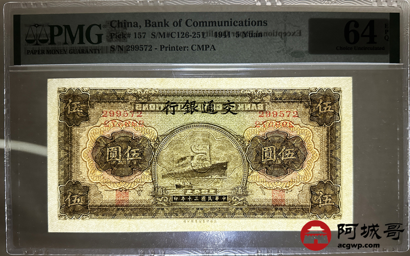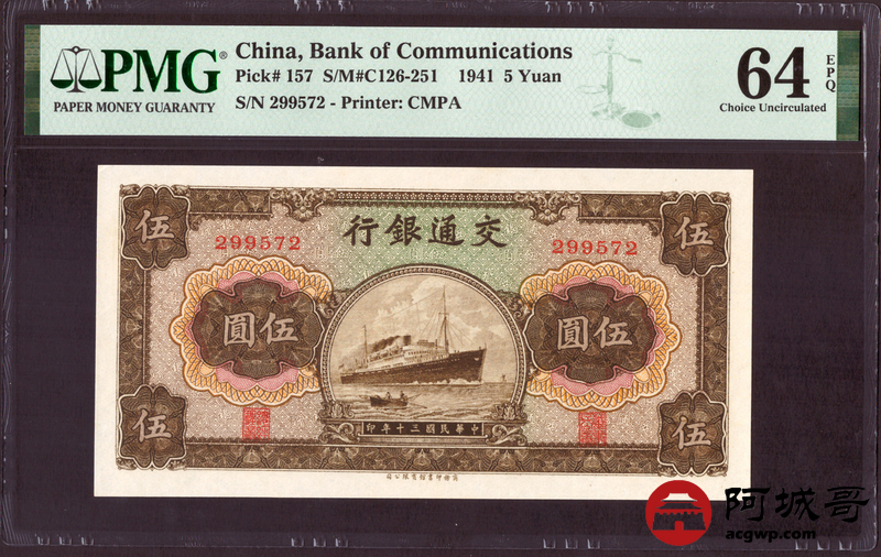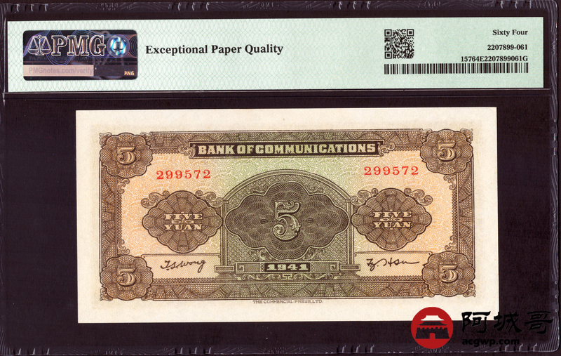 Lot:12 民国30年 交通银行 伍圆 PMG 64EPQ 好号无4