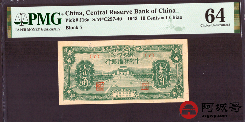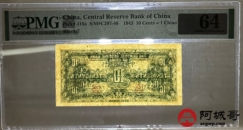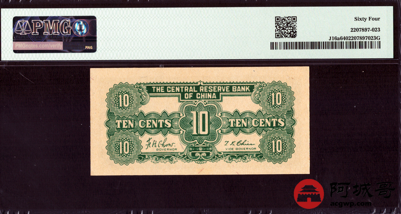 Lot:33 民国32年 中央储备银行 壹角 PMG 64