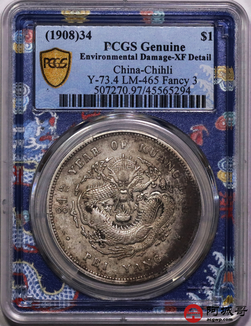 Lot:11 原味老包浆 北洋34七钱二分 大卷三高脚四 PCGS XF