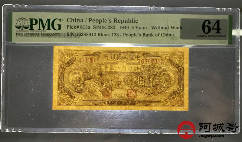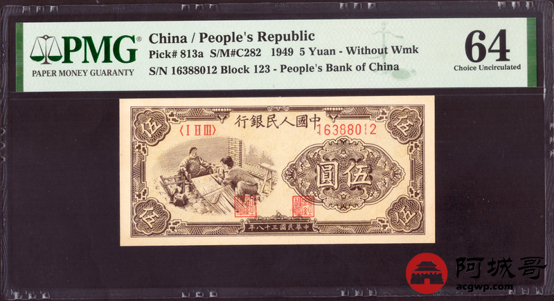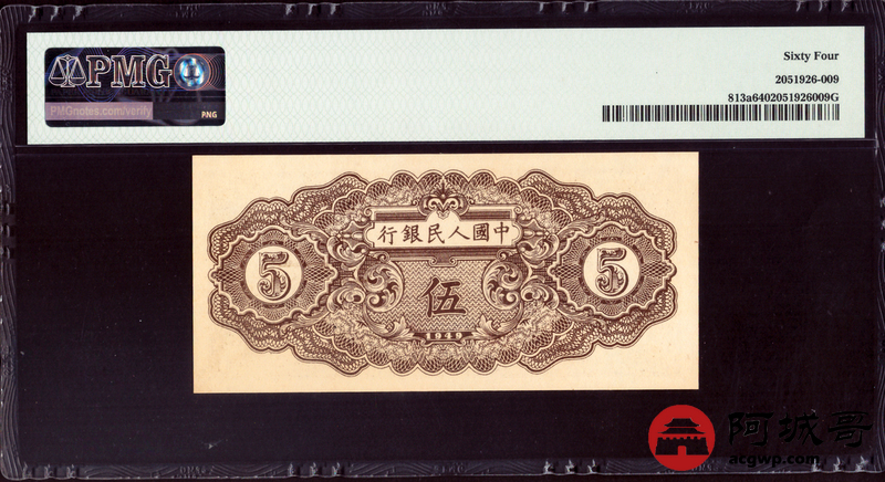 Lot:8 一版 民国三十八年 伍圆织布 PMG 64