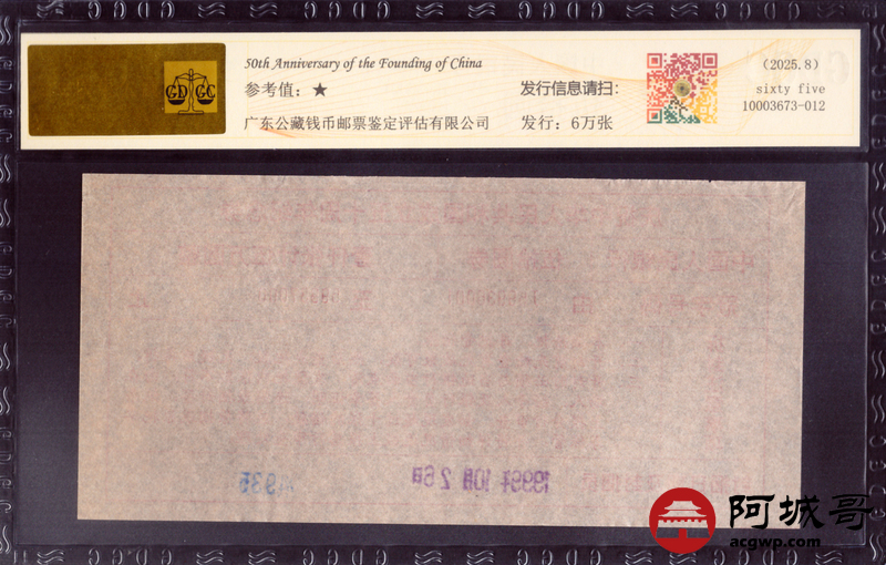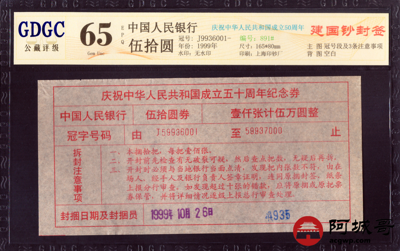 Lot:70 1999年 建国钞封签 公藏评级 65EPQ