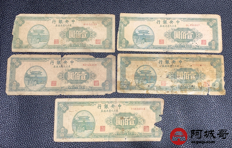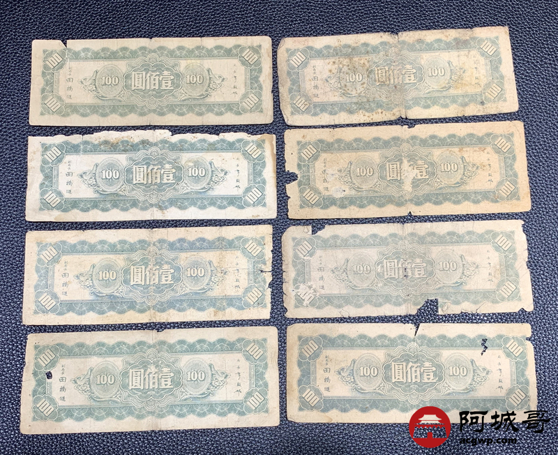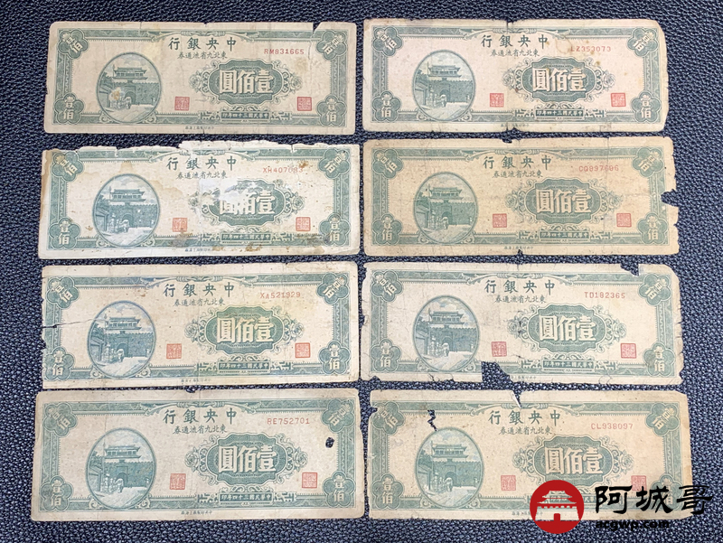 Lot:60 民国三十四年 中央银行 壹佰圆 13张 56成新 9张有黏贴物