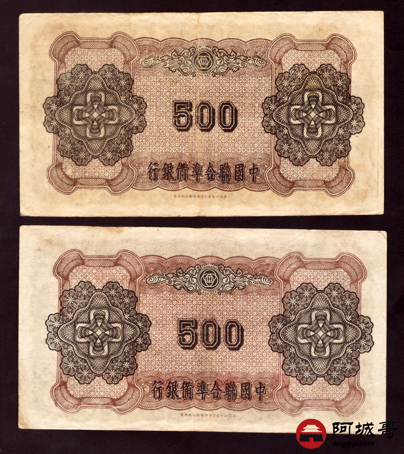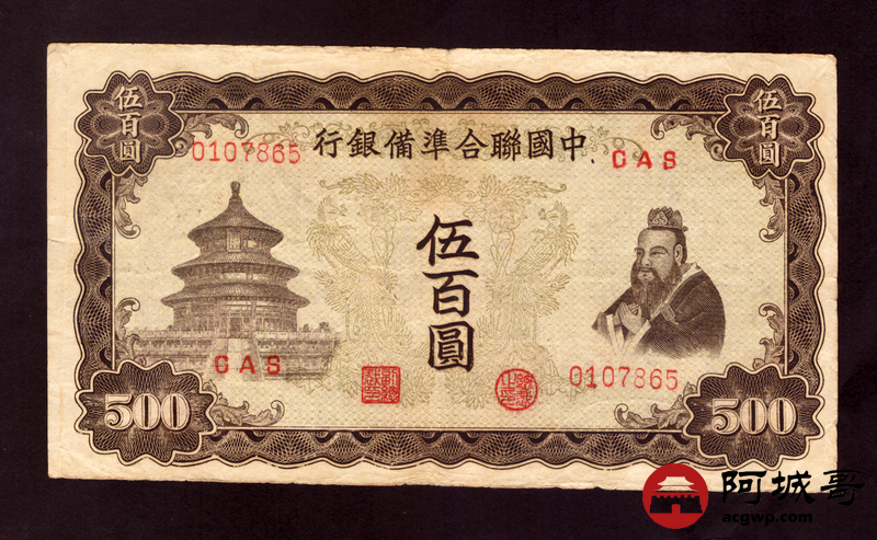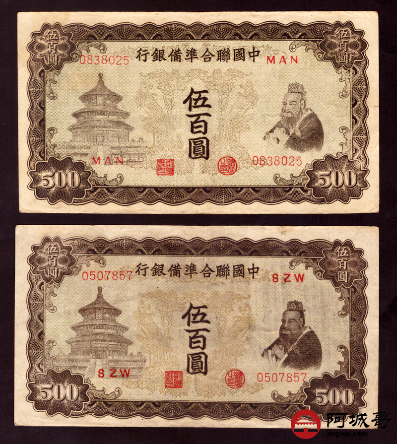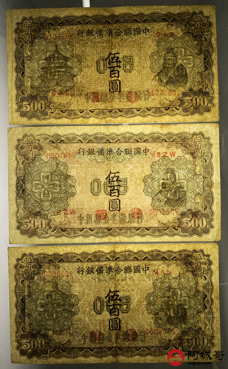 Lot:38 中国联合准备银行 伍佰圆 3张 69至7成新
