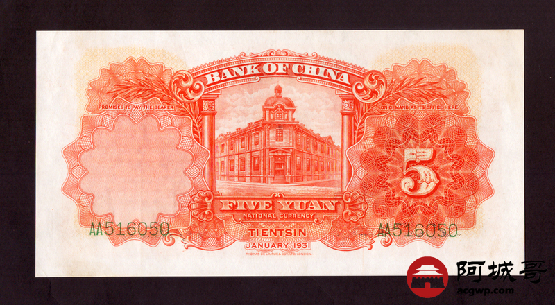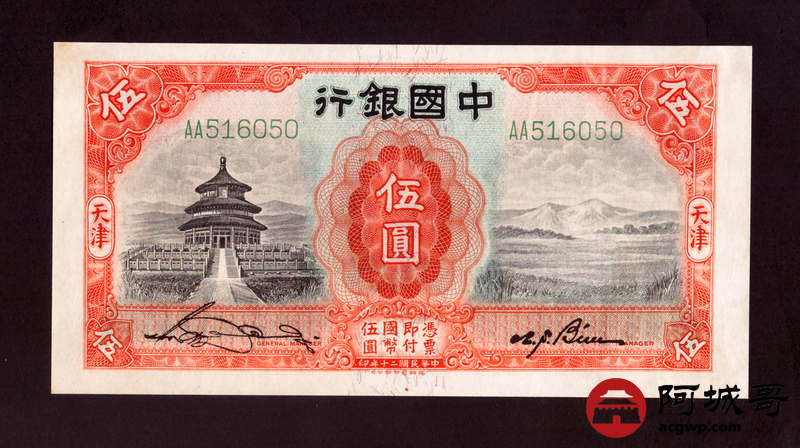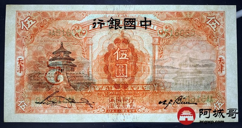 Lot:65 民国二十年 中国银行 伍圆 天津地名 85至88成新