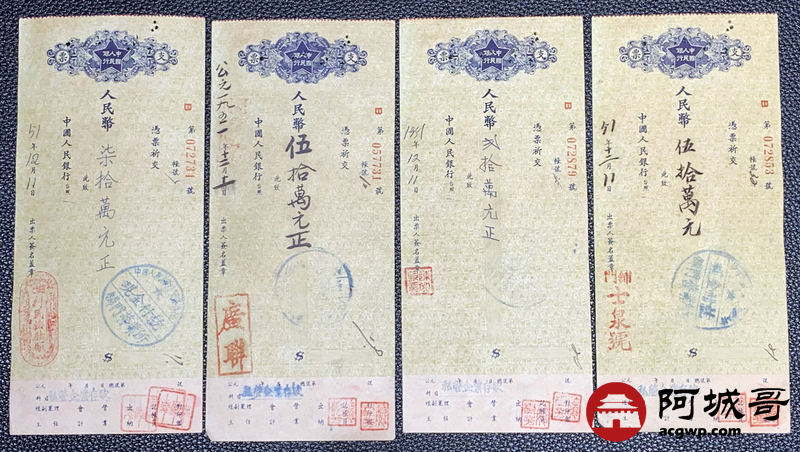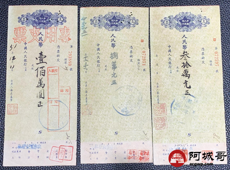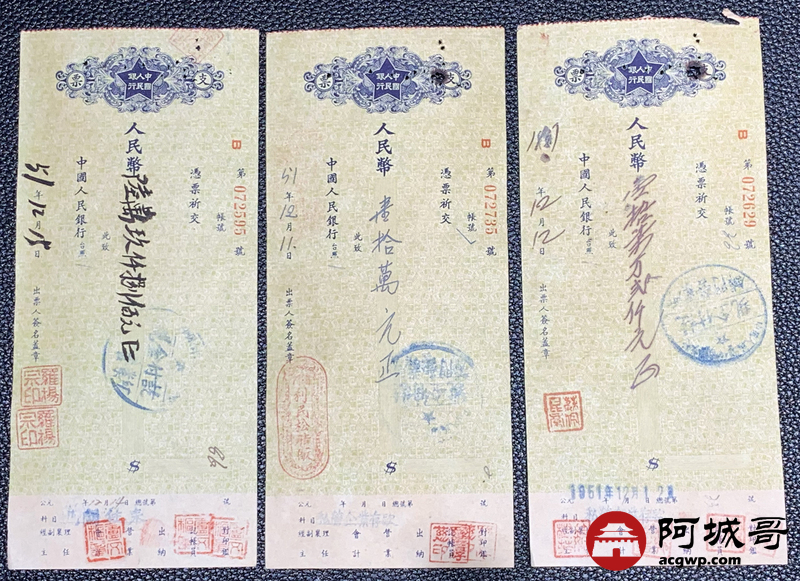 Lot:43 1951年 中国人民银行 支票 10张