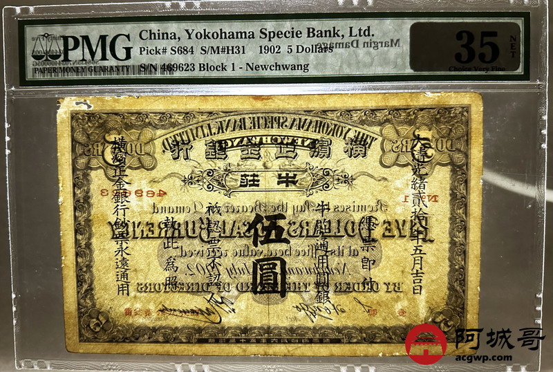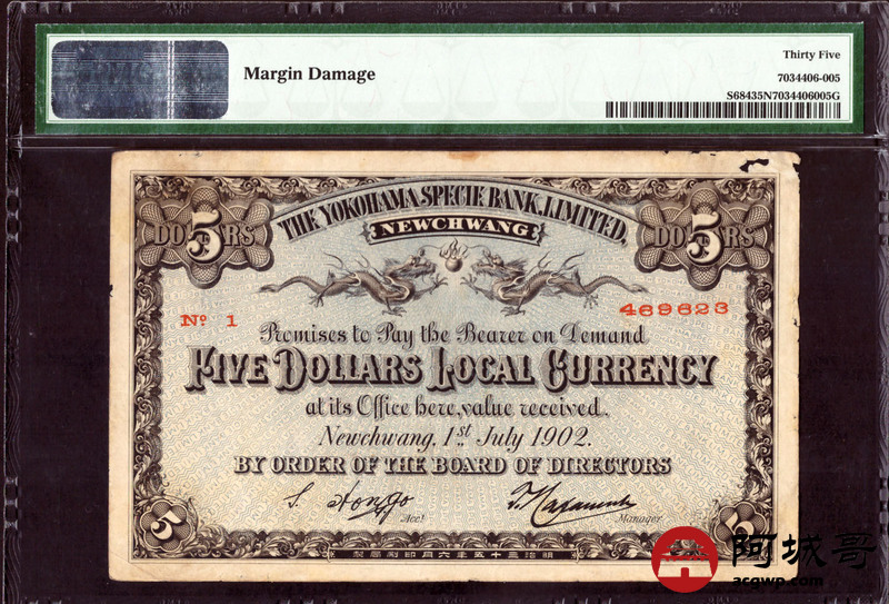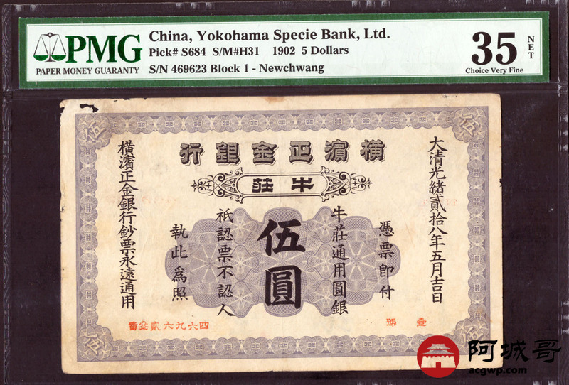 Lot:31 大清光绪贰拾八年 横滨正金银行 伍圆 牛庄地名 非常少见 珍稀品种 PMG 35