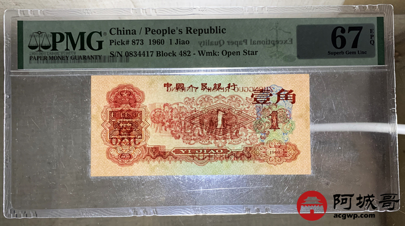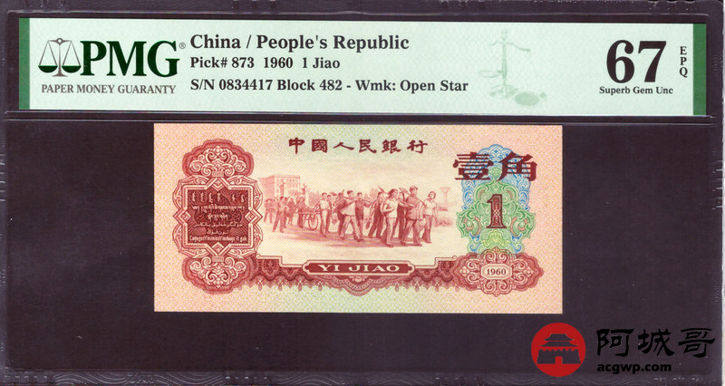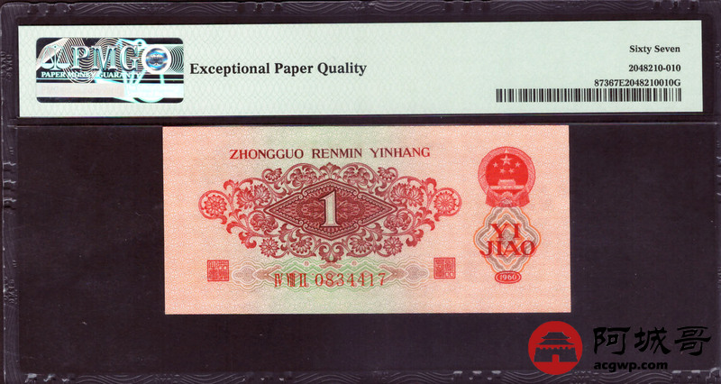 Lot:10 三版 1960年 中国人民银行枣红壹角 PMG 67EPQ