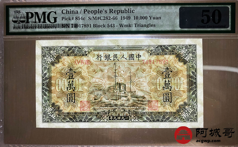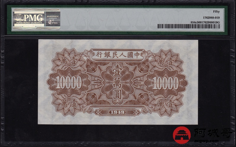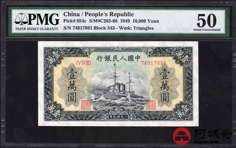 Lot:18 一版 1949年 壹萬圆军舰 PMG 50 菱花水印