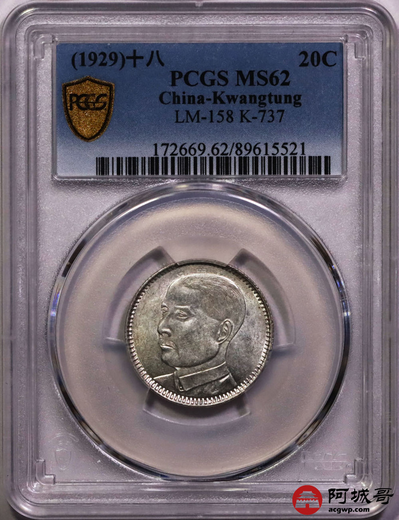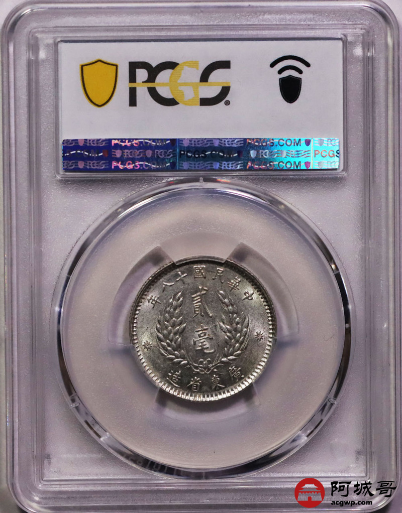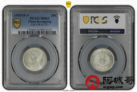 Lot:39 原光 民国十八年广东孙像贰豪 PCGS MS62