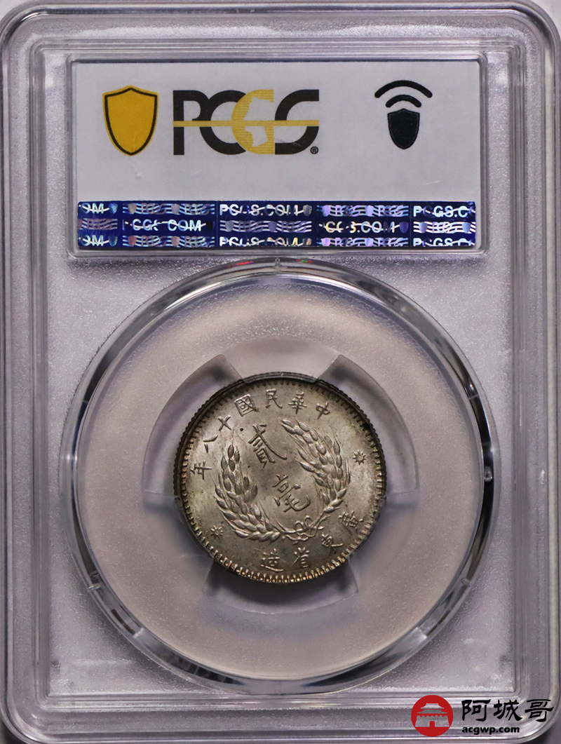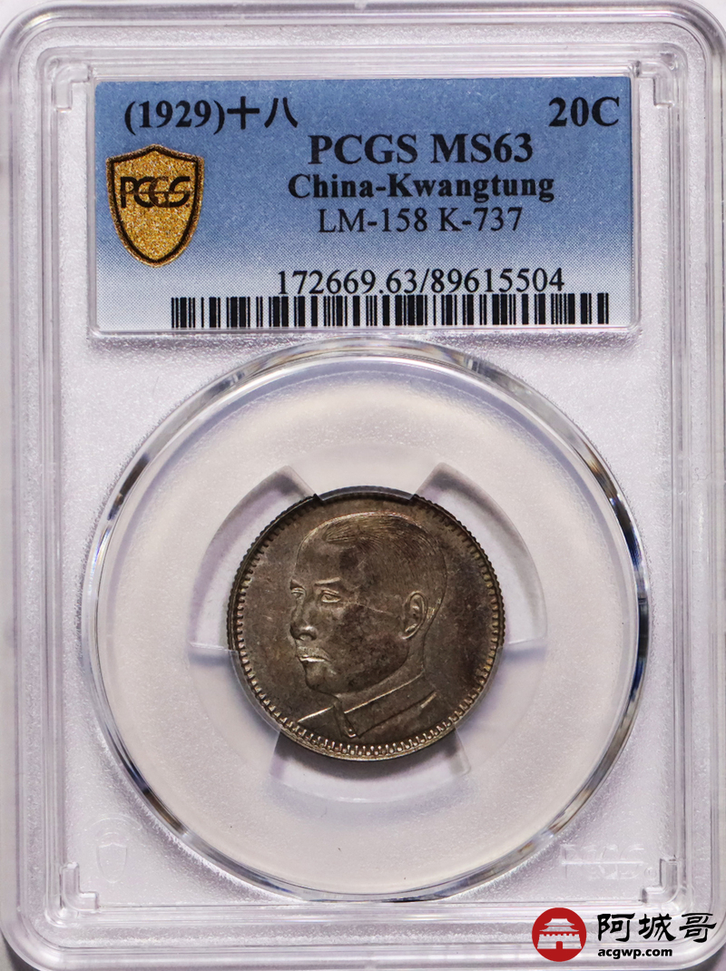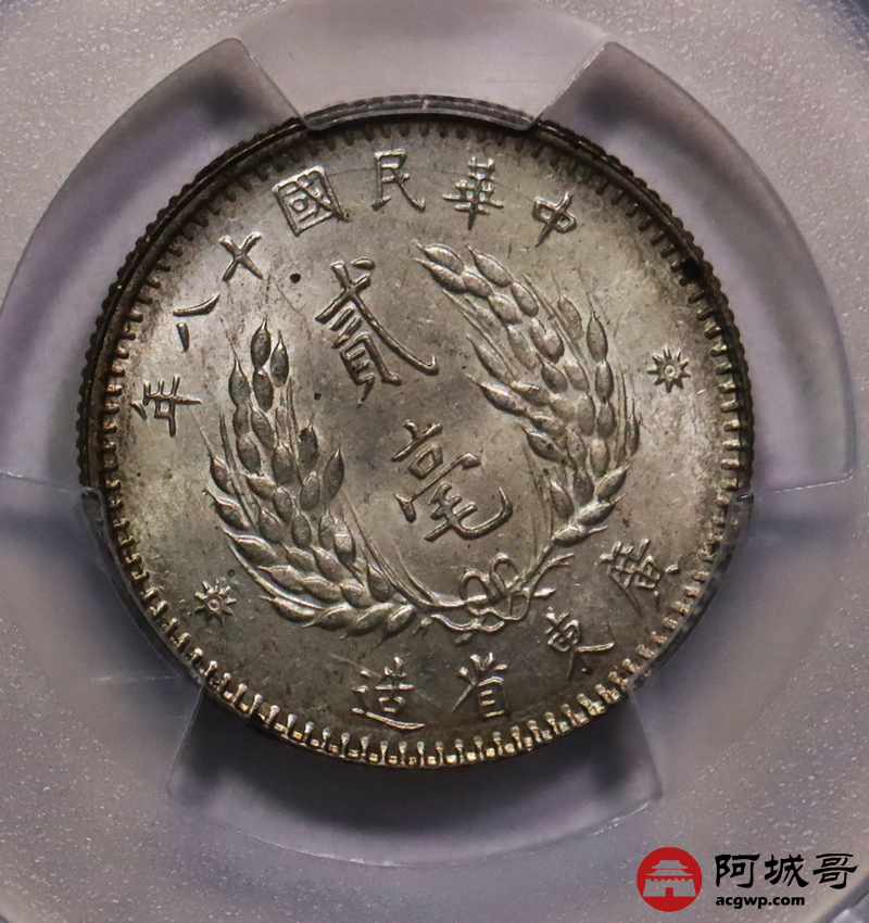 Lot:39 卷首酱彩原光 民国十八年广东孙像贰豪 PCGS MS63