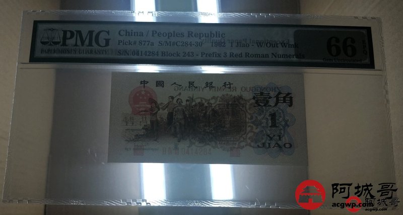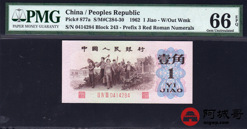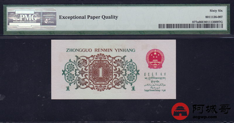Lot:21 三版人民币 1962年 背绿壹角 三版小珍品 中国人民银行 PMG 66 EPQ