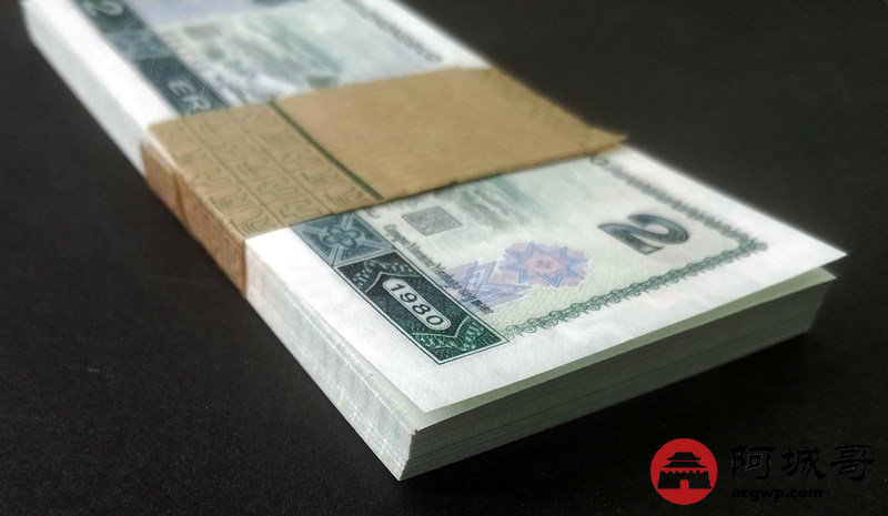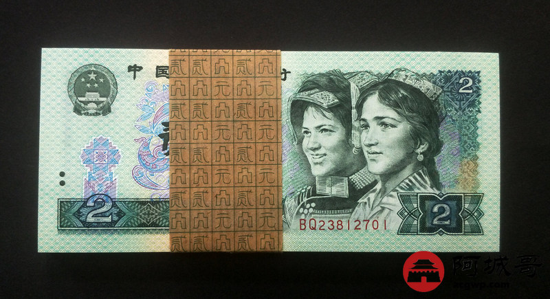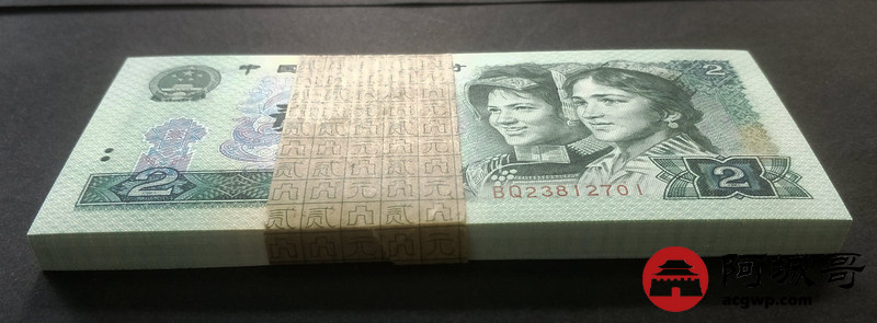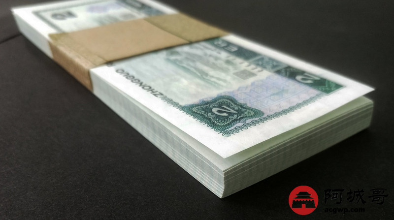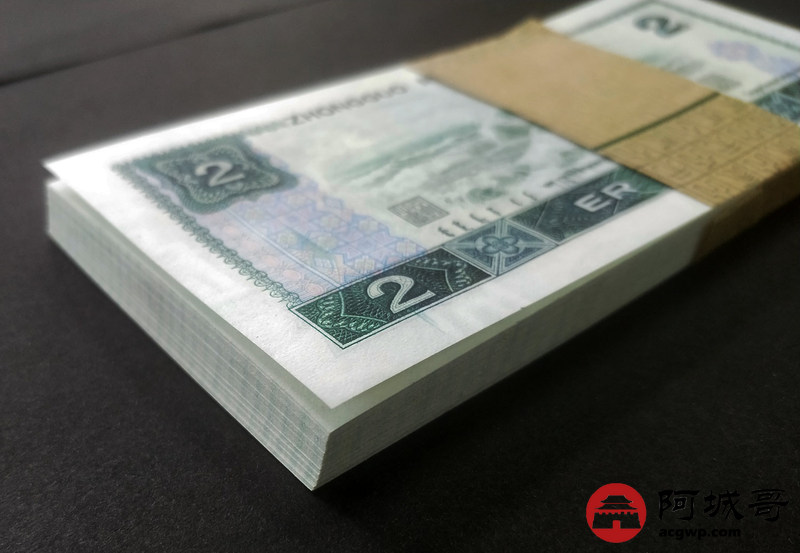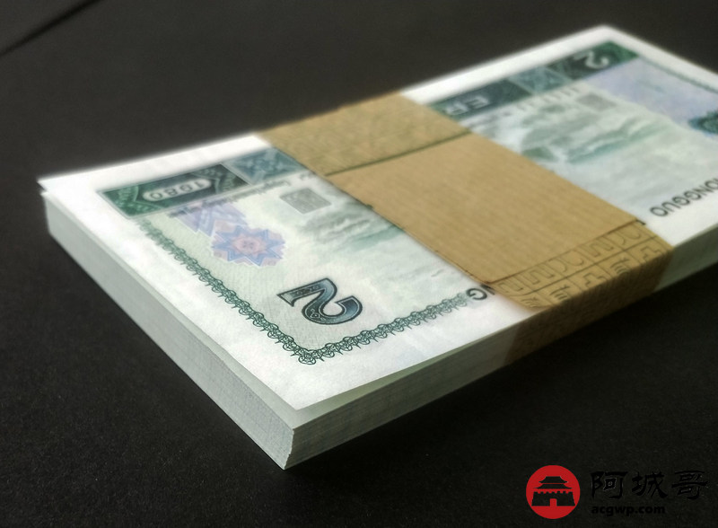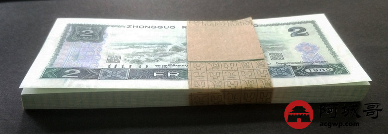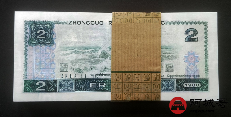 Lot:10 四版人民币 1980年 贰圆 中国人民银行 一刀百联 好号无4 原票全新绝品 四角尖白 灯下无斑
