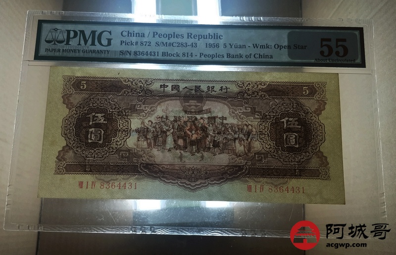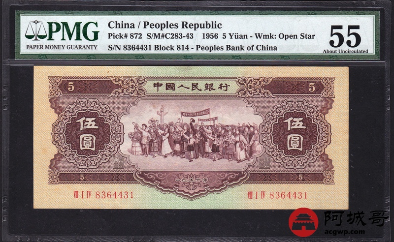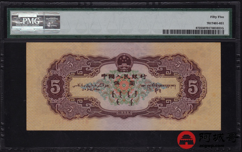 Lot:25 二版人民币 一九五六年 五圆各族人民大团结 五星水印 中国人民银行 PMG 55