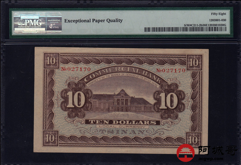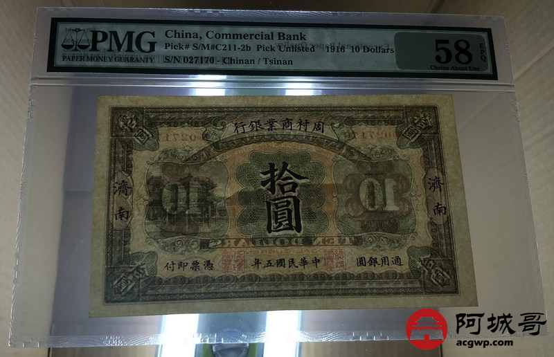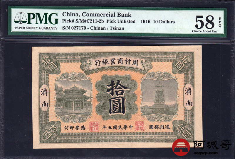 Lot:28 B、周村商业银行 民国五年 济南地名 拾圆 PMG 58 EPQ