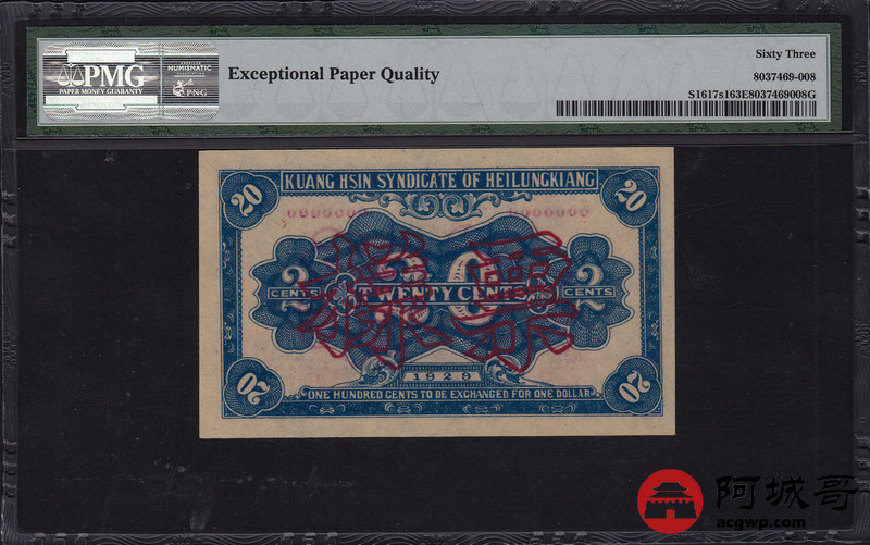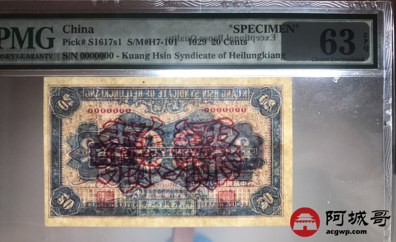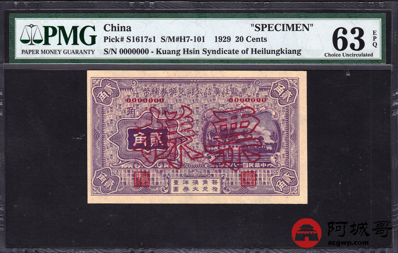 Lot:25 民国28年 黑龙江广信银行辅币券 贰角 票样 PMG 63 EPQ 较少见