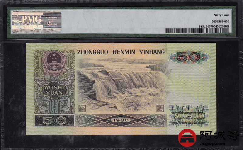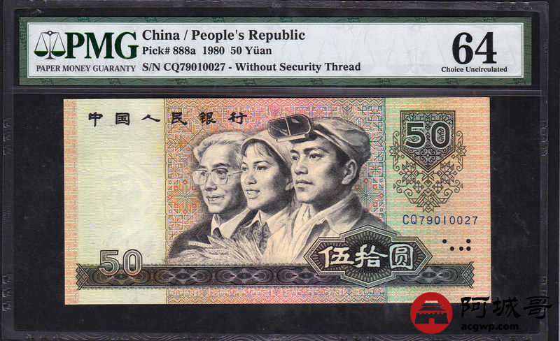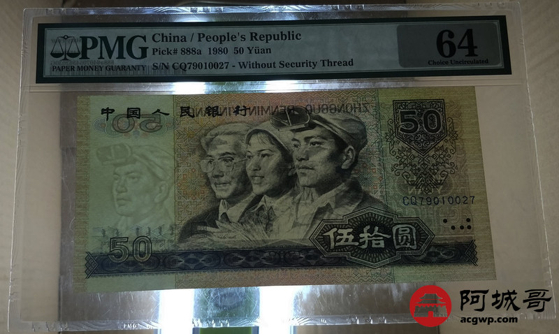 Lot:21 四版人民币 1980年 伍拾圆 四版币王 冠号CQ 中国人民银行 PMG 64 好号无4