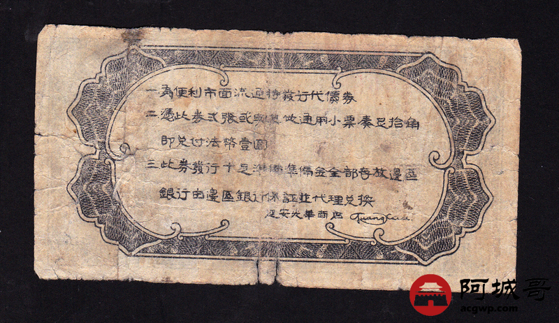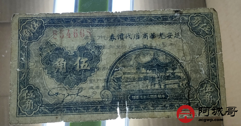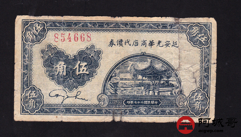 Lot:2 民国27年 伍角 延安光华商店代价券 有修 7成新