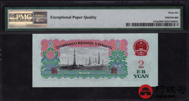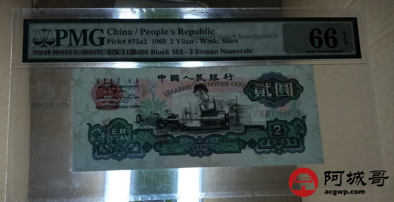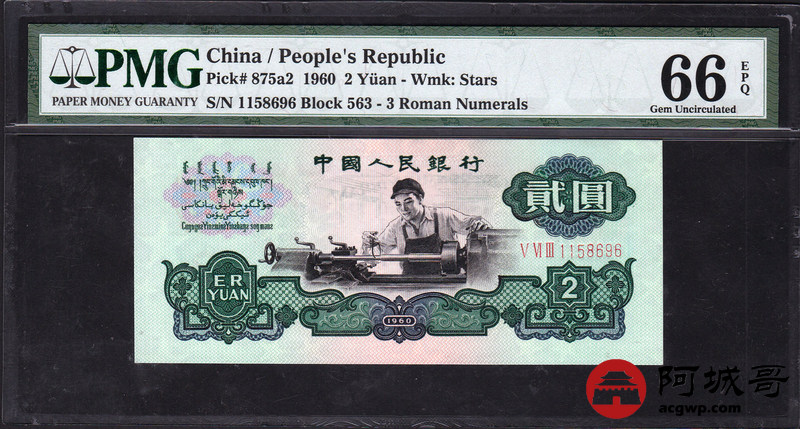 Lot:19 三版人民币 1960年 车工贰元 五星水印 中国人民银行 PMG 66 EPQ 好号无47