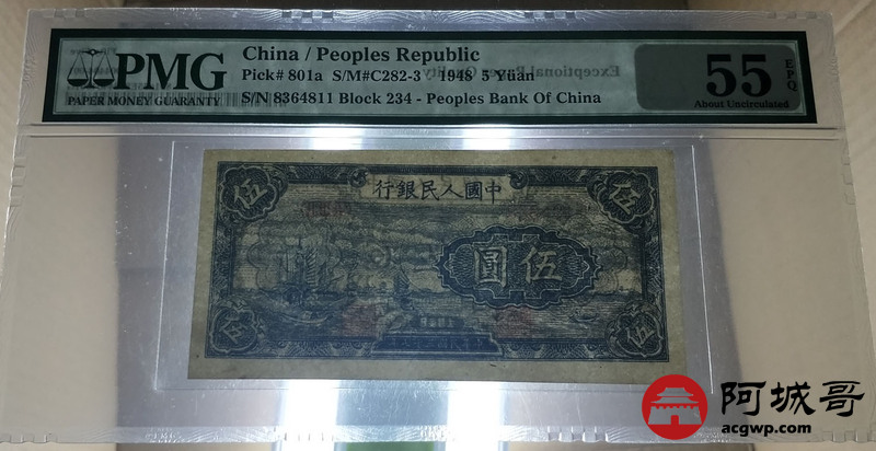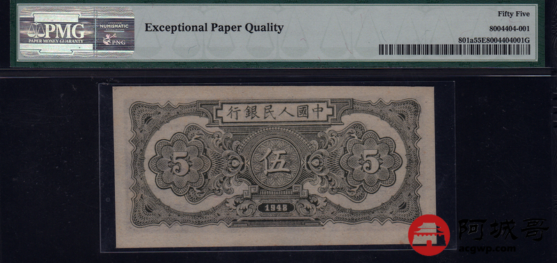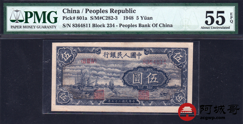 Lot:10 一版人民币 民国37年 五圆小帆船 中国人民银行 PMG 55 EPQ