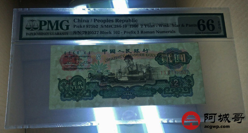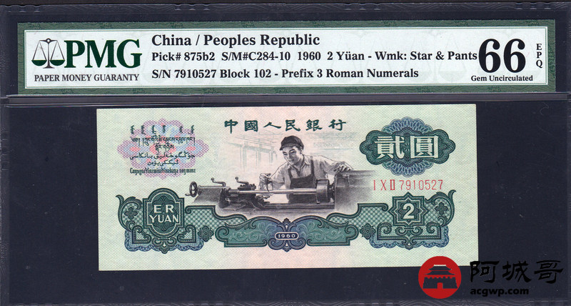 Lot:13 PMG 66E 1960年三版古币车工贰元(全程无4)